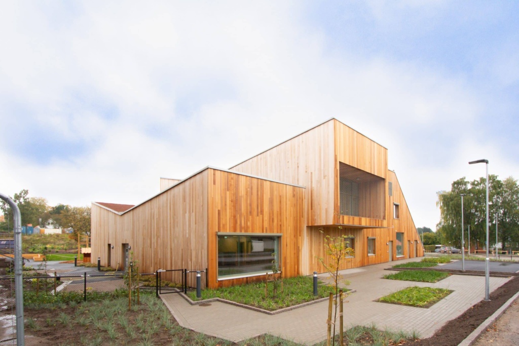 Arkitekt Joachim Lundquist har ritat huset som är uppfört 2021 och har en area om 950 kvm. Fastigheten är byggd med hållbarhet i fokus och miljöcertifierad. Sedumtaket på framsidan ger med sin gröna växtlighet huset en charmig karaktär, och de starka färgerna och skarpa vinklarna är ett annorlunda inslag i stadsbilden.