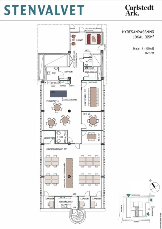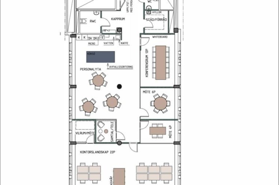 Här har hyresgästen själv möjlighet att påverka planlösning och ytskikt för att anpassa lokalen efter just er verksamhet. Den här visionsbilden av planlösning erbjuder 22 arbetsplatser i öppet kontorslandskap, konferens- och mötesrum i varierande storlekar samt personalytor inkl wc.