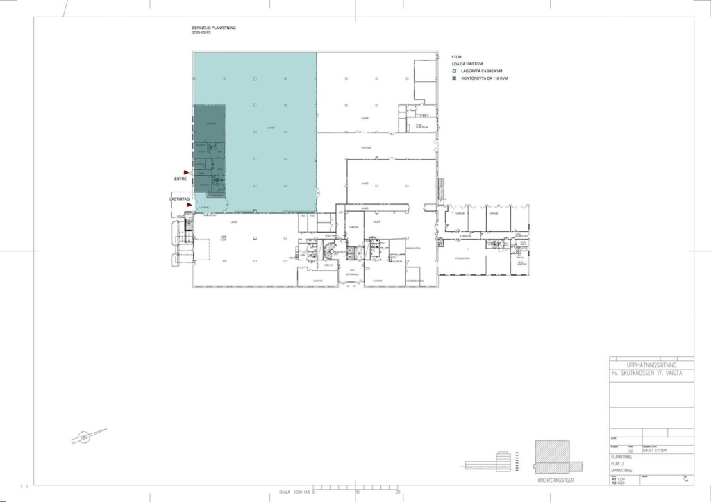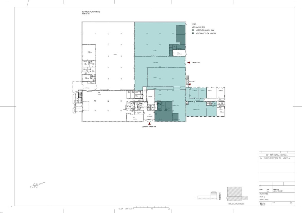 Lokalen är belägen på markplan och passar utmärkt för lager, verkstad, lätt industri och kontorsverksamhet. Lokalen är indelad i flera separata enheter, vilket gör det möjligt att hyra ytor från 500 kvm eller hela lokalen på cirka 3000 kvm. Det finns ett flertal entréer in till lokalen likväl som att lastintag/varumottagning möjliggörs från två sidor. Takhöjden varierar mellan 3-3,2 meter i lagerytorna.